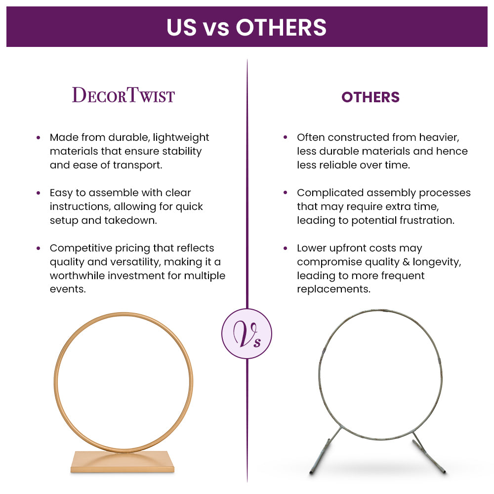 - Premium Material: Circular Backdrop Stand is made from high-quality metal with a sleek gold finish, ensuring both durability and a refined appearance. Its sturdy frame is designed to support a variety of decorations, making it a reliable choice for any event. Unlike flimsy alternatives, this stand offers excellent stability, giving you peace of mind for your decor needs.